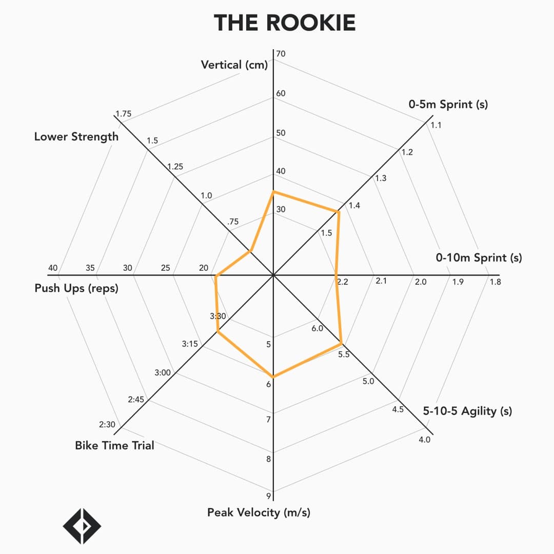 Example of how a players performance radar may look - this can be compared to other team members or even elite level athletes if you have the data: